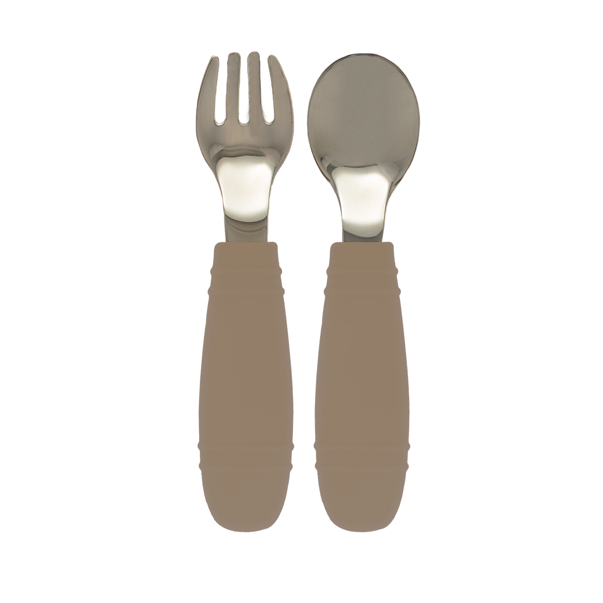 Lækkert og behageligt børnebestik produceret af rustfrit stål + 100% fødevaregodkendt silikone.