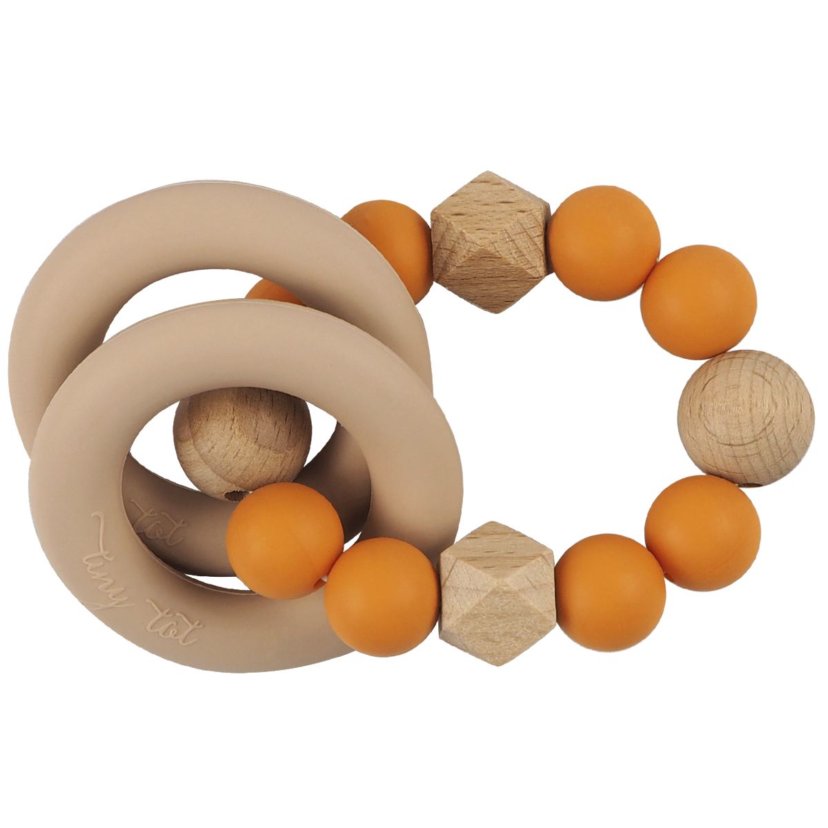 Ranglen er håndlavet af 100% fødevaregodkendte silikoneperler, store silikoneringe og håndpolerede bøgetræsperler, som sammen giver et unikt design. De fine bløde silikoneperler og de store silikoneringe er behagelige at tygge på og masserer nænsomt barnets ømme gummer. Nem at holde fast i for barnet.